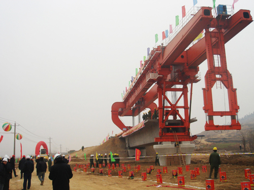 以及生產更新運架產品能架設跨度40M高速鐵路箱梁的:SXJ1000T/40M一跨式架橋機(配套攀爬式運梁車可以實現(xiàn)過隧道零距離架梁)和攀爬式運梁車。并能對現(xiàn)有32M分體式運架設備進行改造,改造后能實現(xiàn)高低位架設跨度40M高速鐵路箱梁(高位改造不能過隧道,把原架橋機改造一跨式,把原運梁車增加2軸。低位改造能過隧道架梁,把原架橋機改造一跨式低位,把原運梁車改成攀爬式運梁車并增加二臺喂梁臺車實現(xiàn)過隧道架梁)。